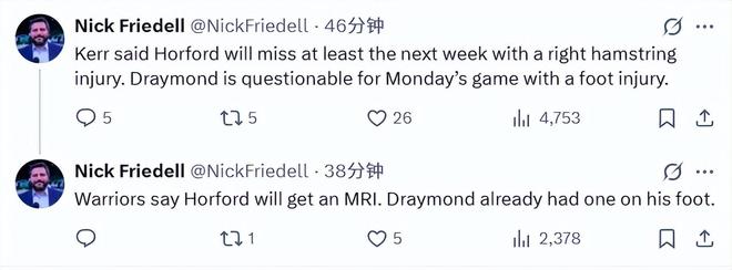39岁老将霍福德遭遇腿筋伤病,至少缺席未来一周比赛,这也意味着他至少不会出战接下来对阵爵士、火箭和鹈鹕这三场比赛。科尔表示,霍福德将接受核磁共振检查。本赛季至今,霍福德为勇士出战12场,场均可以得到5.8分4.3篮板1.8助攻1抢断1盖帽。